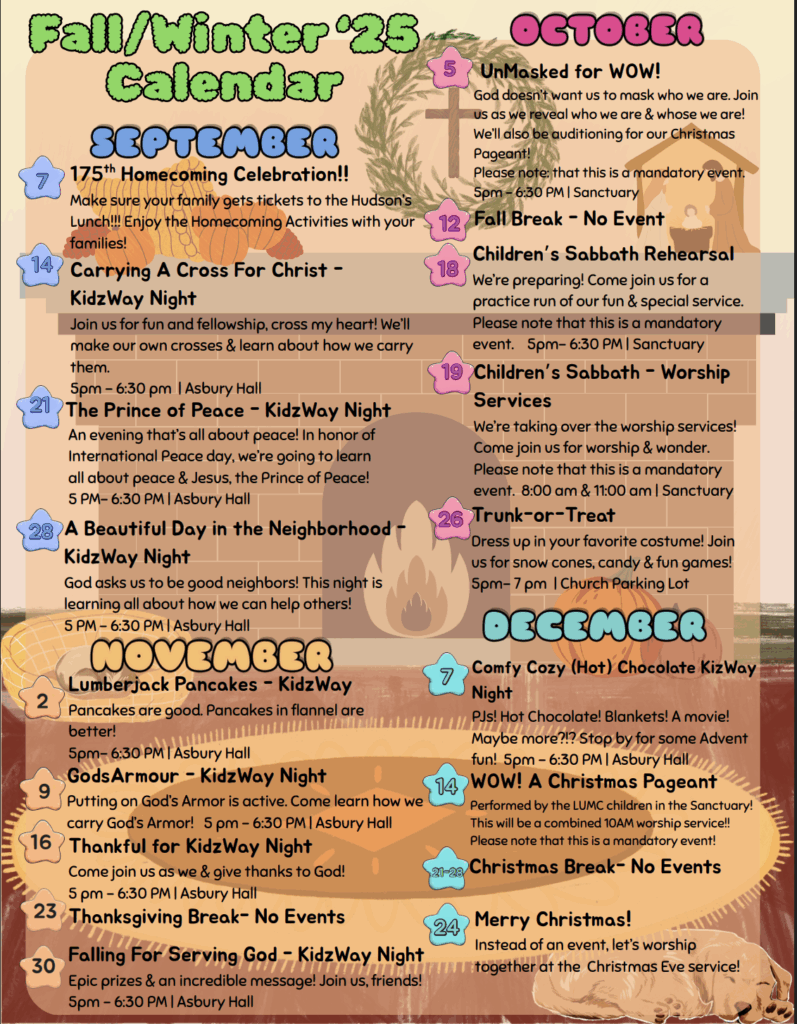 Sunday Evenings: Children meet from 5 – 6:30 for a time of play, creativity, wonder, and growing together in God. Check out the calendar below to see upcoming events and meeting times.