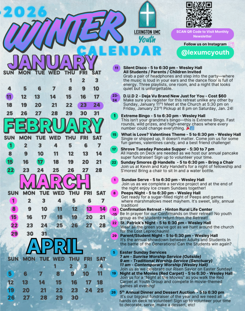 The Youth Ministry at Lexington United Methodist Church seeks to serve ALL students in grades 6th through 12th grade. We currently meet on Sunday Nights from 5 to 6:30 pm in Wesley Hall (the gym). During this time we will play games together, have a devotion together, enjoy a light snack, and just fellowship together as a body of Christ. All are welcome to come join us for these weekly gatherings. For all the latest info regarding upcoming events, click on the Newsletter link below. Our seasonal quarterly calendar is also listed below with a look at future upcoming events. Make sure you take a look because some weeks our meeting times or locations are different! So check out the calendar below!